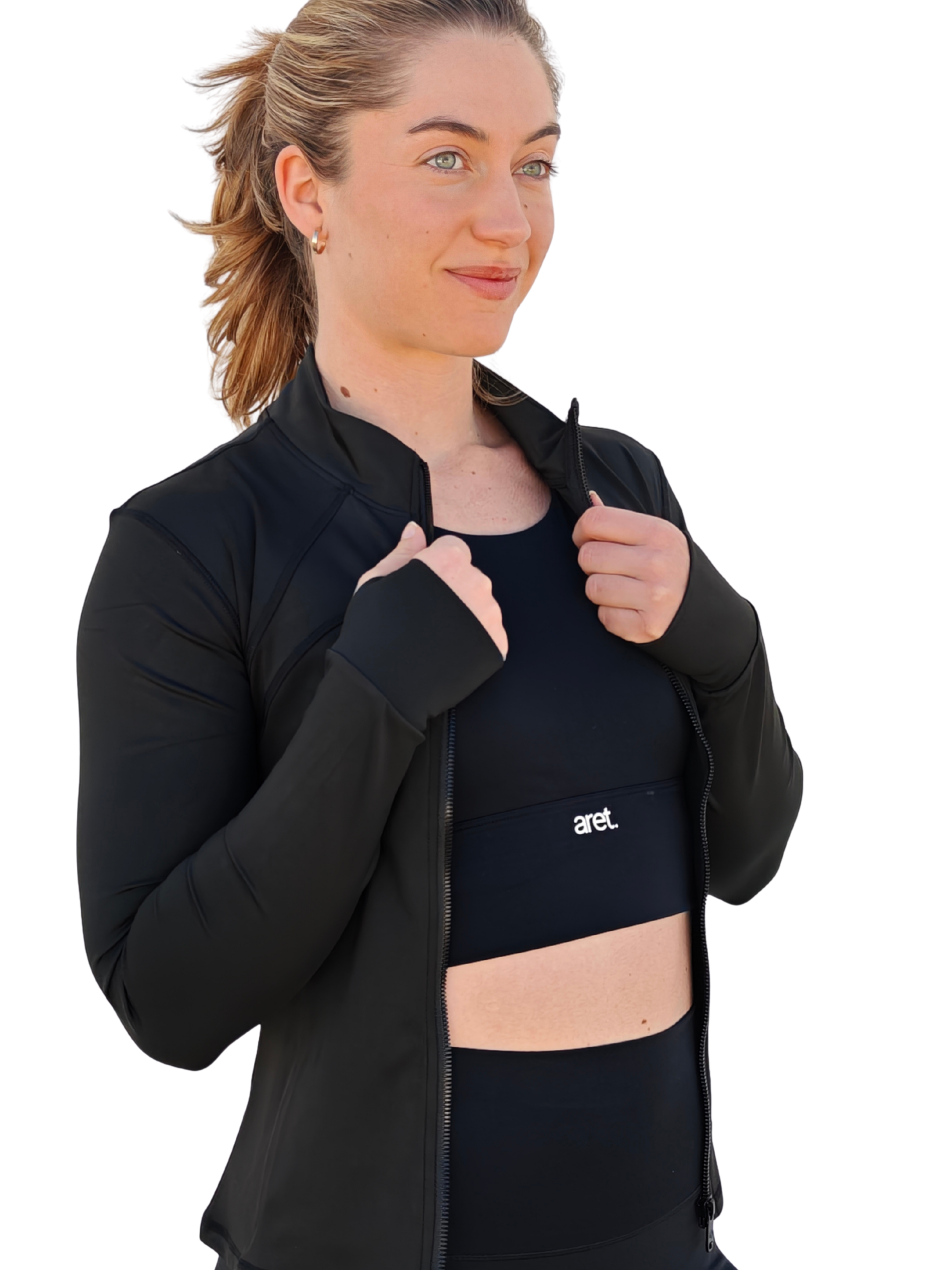Chaqueta ajustada y orificio en el puño para el dedo pulgar, que permite un mejor ajuste y protección en las manos. Adecuada para cualquier práctica deportiva en el exterior.