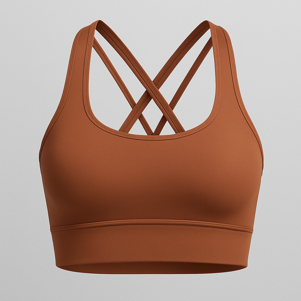 Top deportivo color terracota, con diseño de tirantes cruzados en la espalda que ofrece sujeción y libertad de movimiento. Su tejido suave y elástico se adapta al cuerpo, proporcionando comodidad y estilo tanto para entrenar como para el día a día.